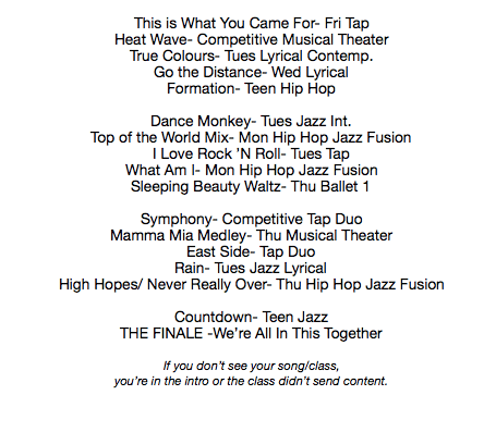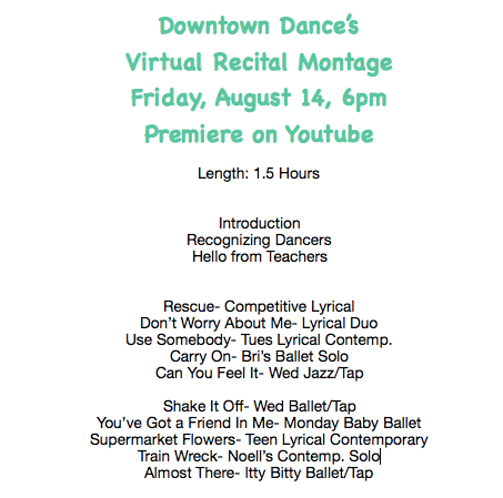 Keep an eye on our Downtown Dance YouTube Page for the”Virtual Recital Montage” slated to premiere at 6pm. Our movie is 1.5 hours long & so we’ve been having technical difficulties getting it to upload. We’re HOPING it’ll appear around 5pm. We’ll send an email around 5pm to give an update.